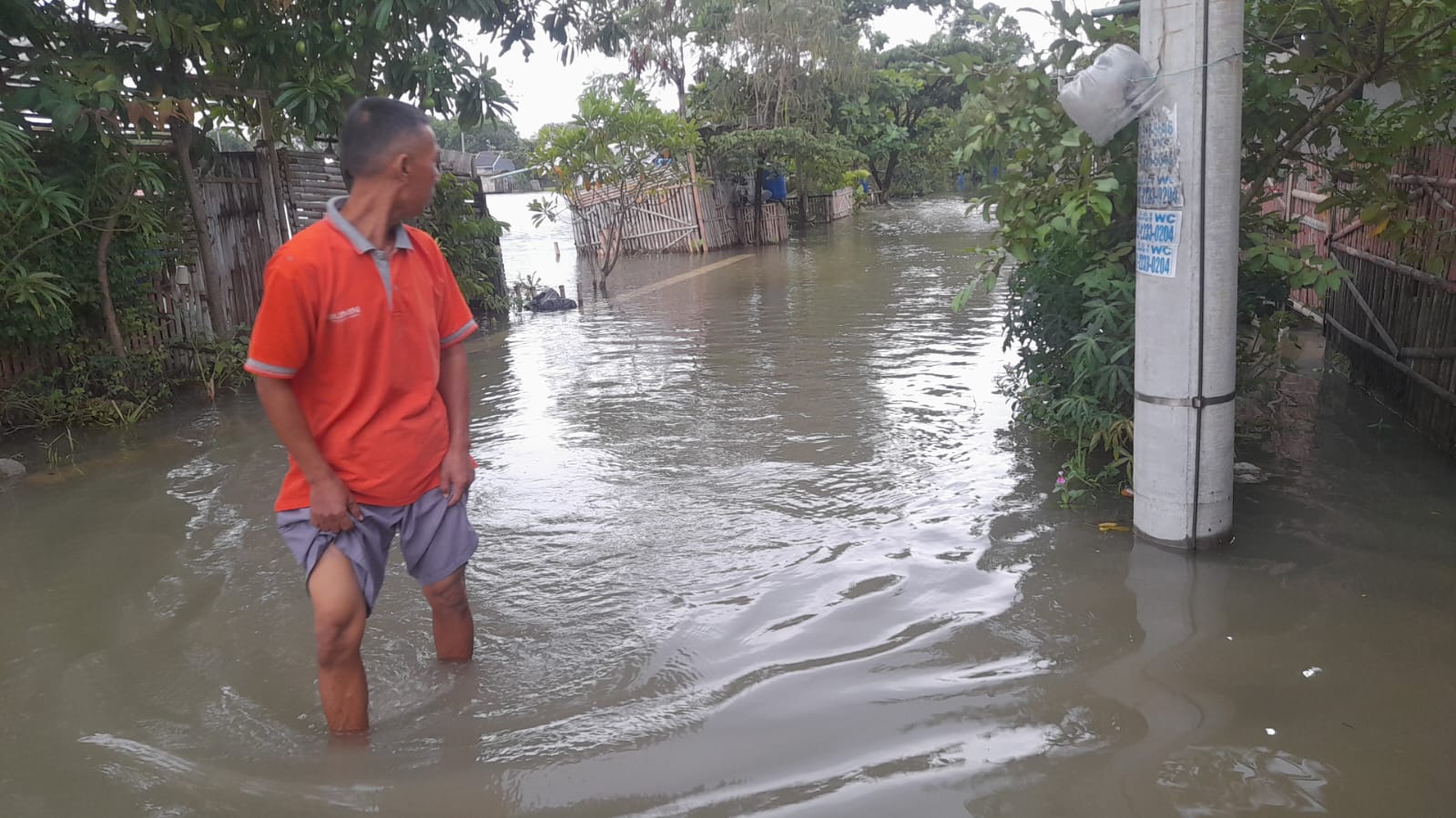 Genangan air dilaporkan mulai masuk ke permukiman warga sejak dini hari. Ketinggian air mencapai lutut orang dewasa dan merendam jalan lingkungan hingga halaman serta bagian dalam rumah warga. Kondisi tersebut membuat aktivitas masyarakat terganggu.