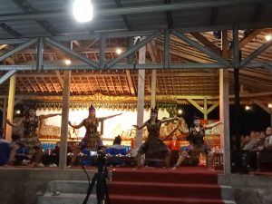 INSKA NEWS,Sidoarjo -Kepala Dinas Pendidikan dan Kebudayaan Kabupaten Sidoarjo, Tirto Adi memberikan gunungan kepada dalang, pada pagelaran Wayang Kulit Gagrak Porongan di Desa Suruh, Sabtu(6/9/2025)malam.