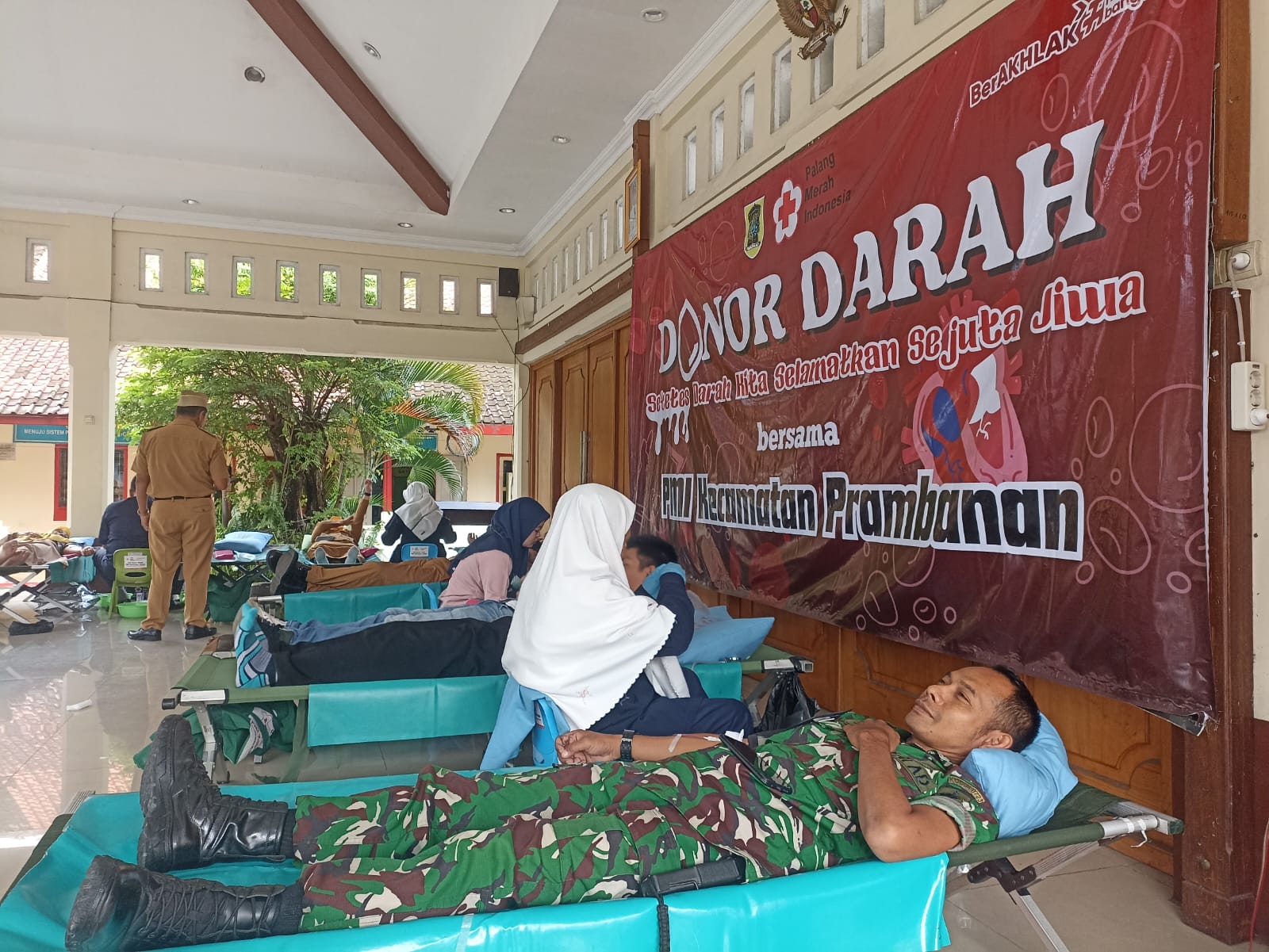 INSKA NEWS,Klaten – Danramil 09/Prambanan Kodim 0723/Klaten, Kapten Inf Basuki bersama lima orang Bintara Pembina Desa (Babinsa) melaksanakan kegiatan donor darah yang diselenggarakan oleh Palang Merah Indonesia (PMI) Kecamatan Prambanan. Kegiatan tersebut berlangsung di Pendopo Kantor Kecamatan Prambanan Kabupaten Klaten, dan bertujuan untuk menumbuhkan solidaritas kemanusiaan serta membantu ketersediaan stok darah. Selasa (27/01/2026)