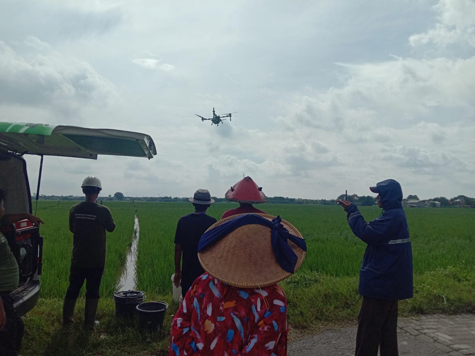Dari sisi teknis, petugas pertanian menjelaskan bahwa biaya penggunaan drone sprayer berkisar Rp4–5 juta per hektar, dengan sistem pembayaran setelah panen. “Kantor pusat perusahaan ada di Surabaya, cabang terdekat di Subang, dan gudang di Rengasdengklok, Karawang. Kekuatan baterai drone sekitar 7–8 menit sebelum perlu diisi ulang,” jelasnya.