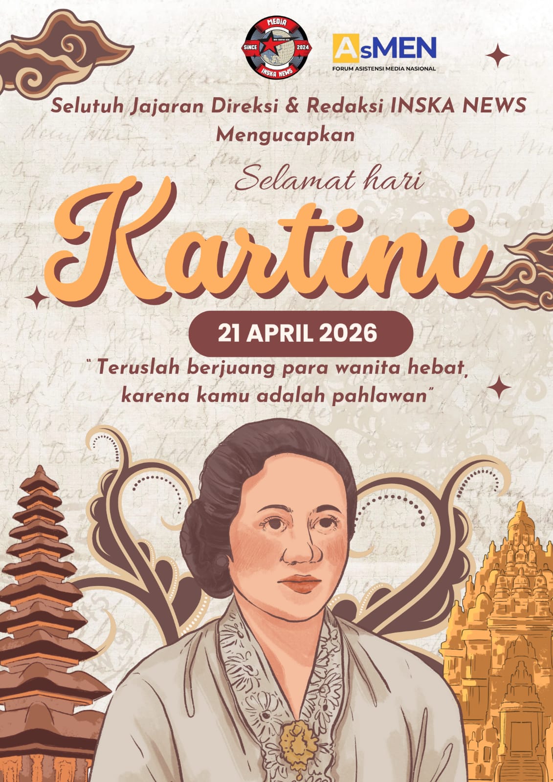 Inskanews, 21 April 2006 — Seluruh jajaran direksi dan redaksi InskaNews dengan penuh rasa hormat dan kebanggaan mengucapkan selamat Hari Kartini kepada seluruh perempuan Indonesia. Momentum 21 April setiap tahunnya menjadi pengingat akan jasa besar Raden Adjeng Kartini, sosok pelopor emansipasi wanita yang telah membuka jalan bagi lahirnya generasi perempuan tangguh, berani, dan berdaya.