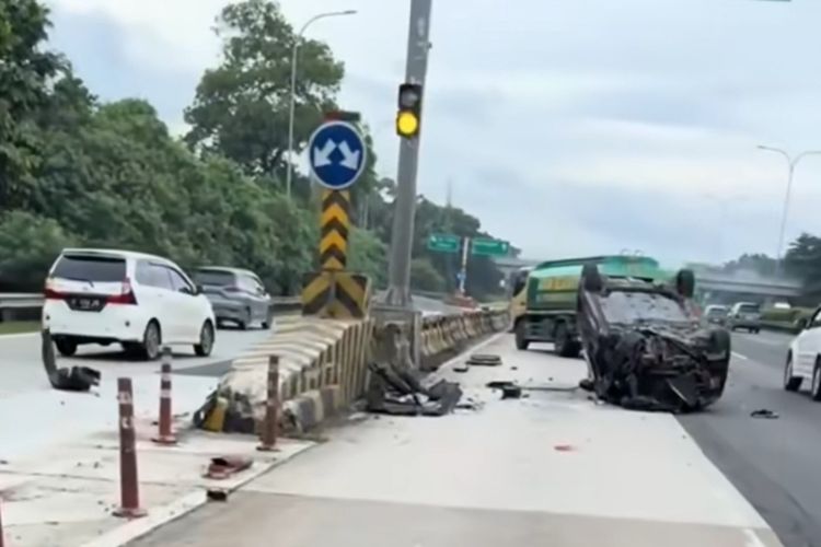 Benturan keras tersebut menyebabkan mobil Honda City terbalik dengan posisi keempat roda berada di atas badan jalan. Kendaraan kemudian berhenti di jalur A Tol Jagorawi arah Bogor dan sempat menghalangi arus lalu lintas.