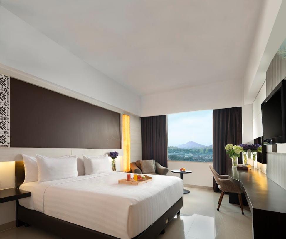 Bagi tamu yang menginginkan pengalaman menginap yang lebih istimewa, Deluxe Mountain View menjadi pilihan yang sulit ditandingi. Dari balik jendela kamar, pemandangan Gunung Merapi dan Merbabu menyambut dengan siluet yang menenangkan, sebuah kemewahan yang jarang ditemui, terlebih di tengah kota Magelang.Dengan luas 25 meter persegi, kamar ini dilengkapi berbagai fasilitas eksklusif seperti priority check-in di lounge, welcome drink dan oshibori, amenities lengkap, bathrobe, turndown service, light snacks sore, hingga pijat pundak 15 menit yang membantu tubuh kembali rileks setelah seharian beraktivitas. Semua dirancang untuk membuat tamu betah, bahkan ingin memperpanjang masa tinggalnya.