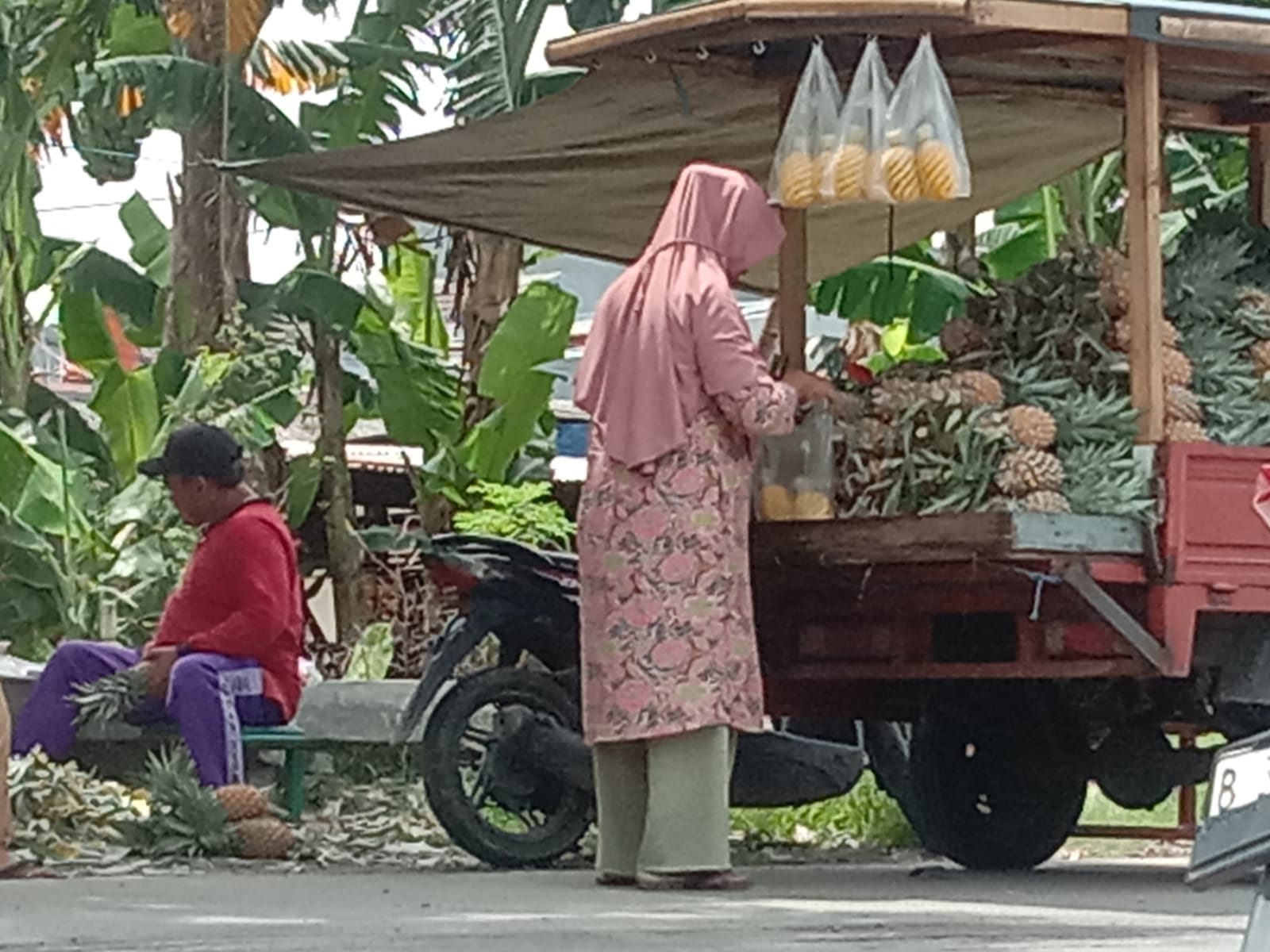 Agus dan Sumarni , pasangan suami istri, setia menjajakan nanas kupas segar. Dengan pisau kecil yang sudah tampak aus, Agus mengupas nanas satu per satu dengan cekatan, memastikan kulit dan “mata” nanas bersih sempurna. Di sampingnya, Sumarni sigap mengemas potongan nanas ke dalam plastik transparan sebelum diserahkan kepada pembeli.