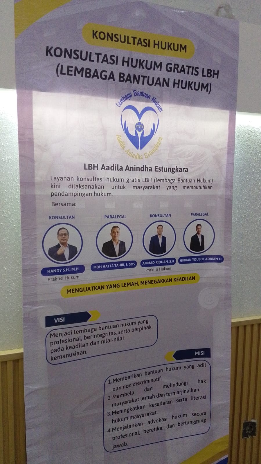 Ia menjelaskan bahwa visi LBH Aadila Anindha Estungkara adalah menjadi lembaga bantuan hukum yang profesional, berintegritas, serta menjunjung tinggi keadilan dan nilai kemanusiaan.
