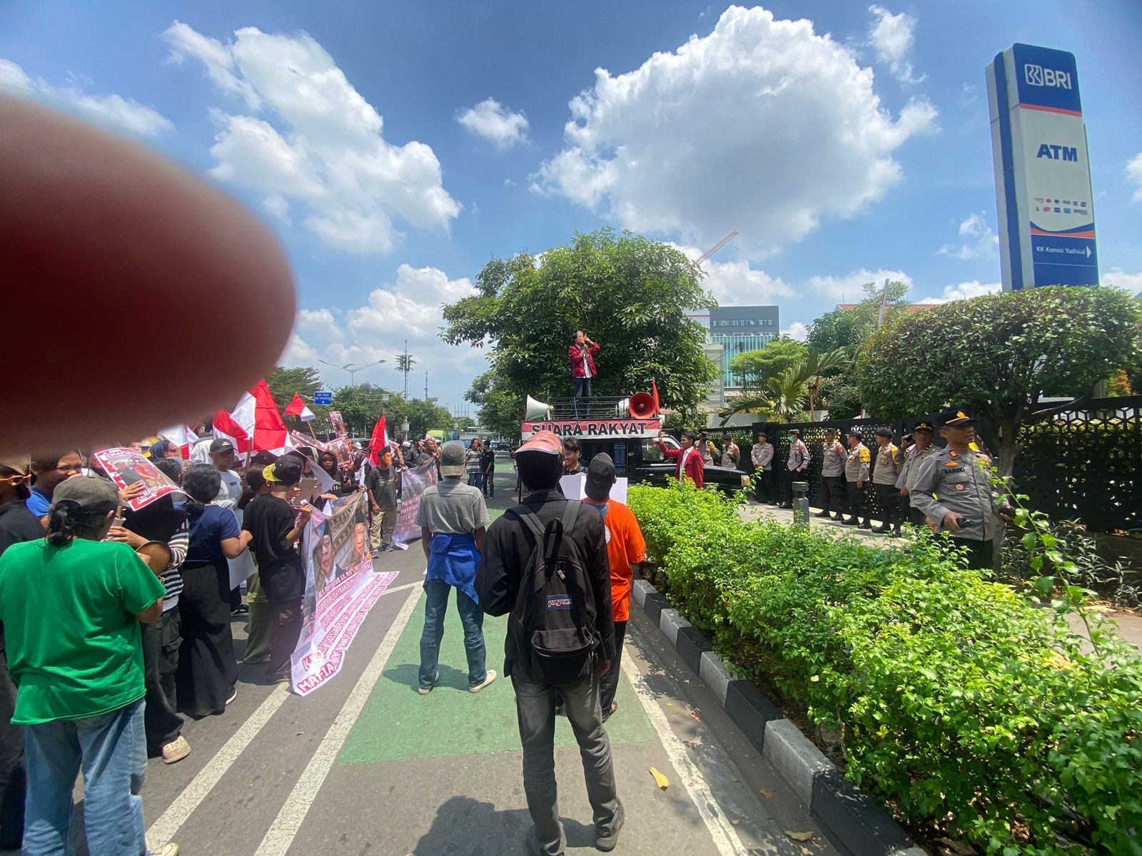 Aksi dimulai sekitar pukul 10.27 WIB dengan membawa sejumlah alat peraga berupa toak, spanduk, poster, topeng muka, dan maket. Dalam orasinya, massa menyuarakan aspirasi terkait dugaan ketidakadilan dalam proses hukum terhadap kasus pertambangan yang melibatkan PT Sultan Rafli Mandiri dan Muhammad Pamar Lubis.