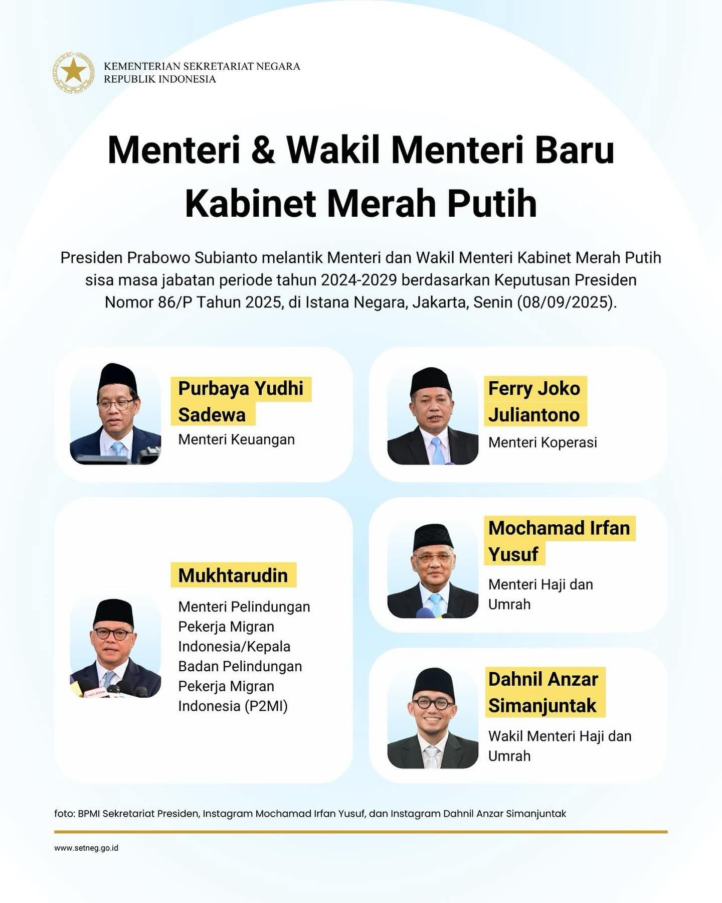 Menteri Sekretariat Negara Prasetyo Hadi membeberkan reshuffle kabinet jilid II. Prasetyo menyebut ada satu kementerian baru, yakni Kementerian Haji dan Umrah.