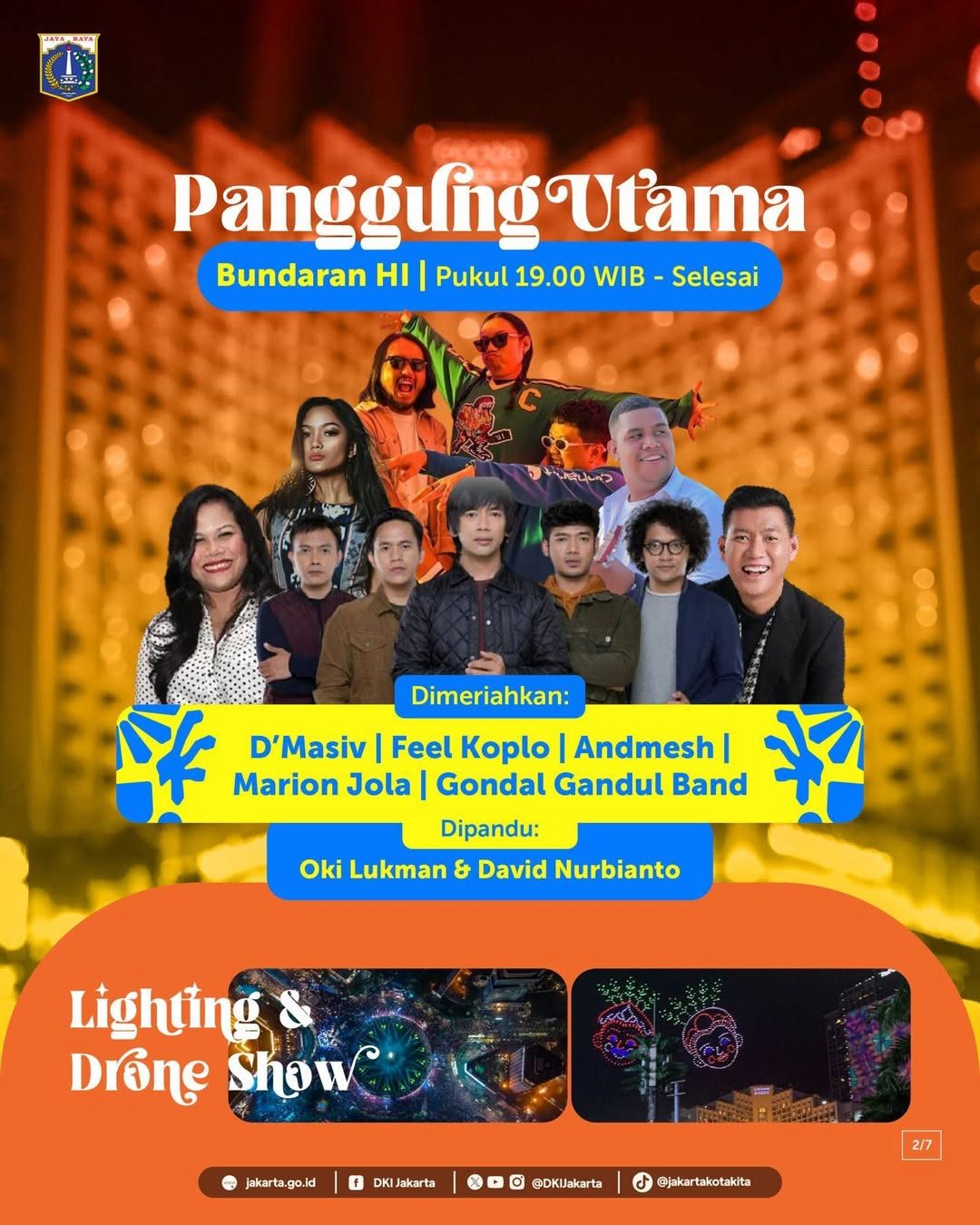 Acara di panggung utama akan dipandu oleh artis Oki Lukman bersama komika David Nurbianto, dan ditutup dengan pertunjukan Lighting & Drone Show yang menjadi puncak perayaan.