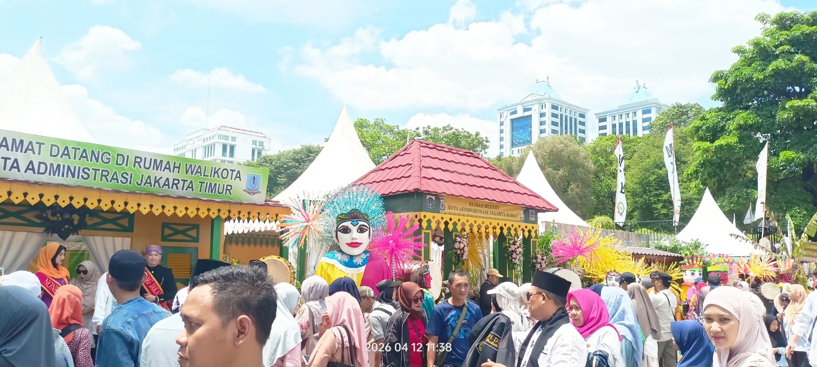 Suasana semakin semarak dengan hadirnya dekorasi warna-warni, ondel-ondel, serta panggung hiburan yang menampilkan seni budaya Betawi. Pengunjung terlihat berjalan santai mengelilingi area acara, sementara anak-anak tampak antusias menyaksikan pertunjukan budaya yang digelar.