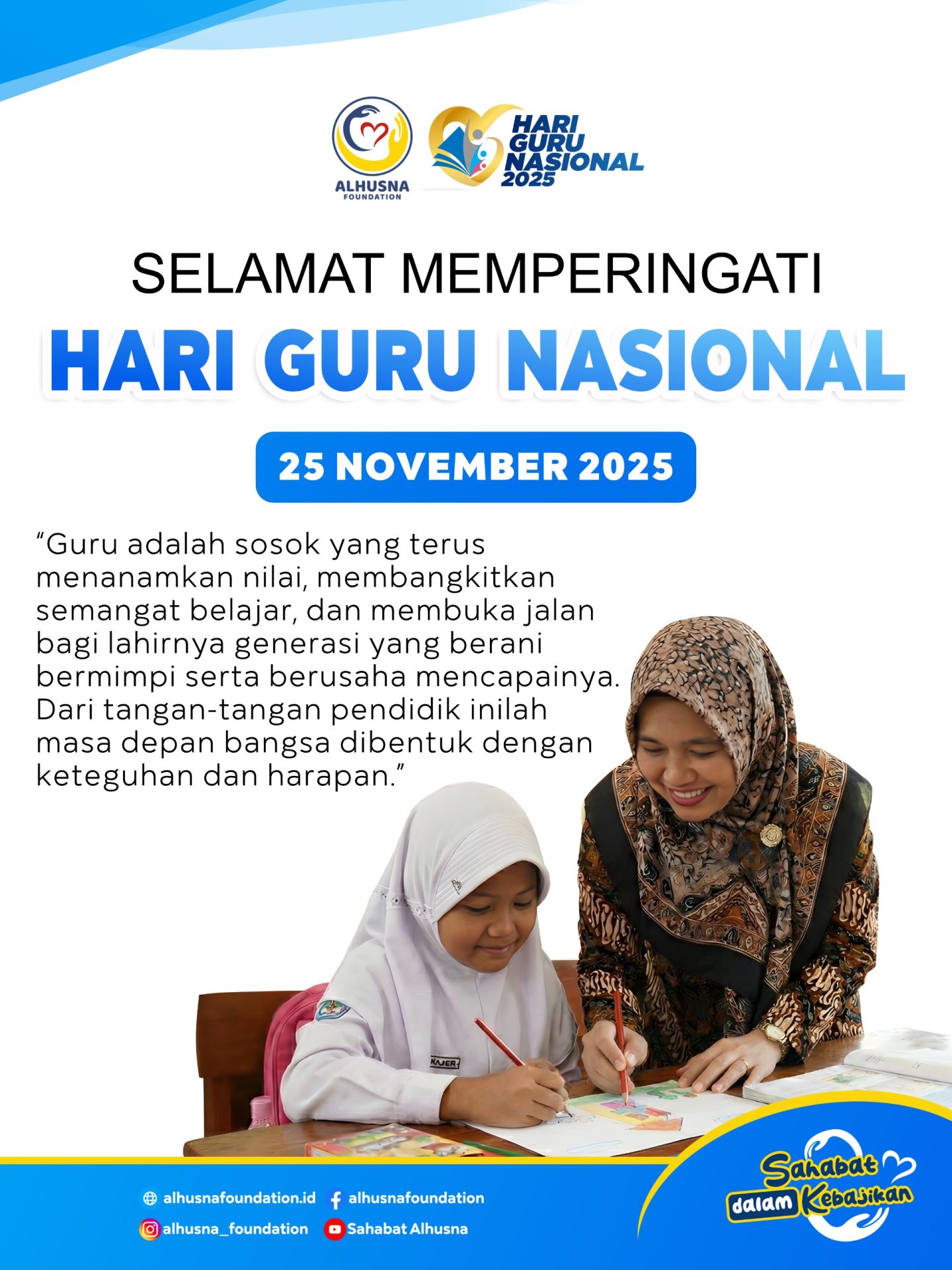 Dengan semangat Hari Guru Nasional, Yayasan Sahabat Insan Alhusna  mengajak seluruh elemen masyarakat untuk terus menghargai dan mendukung para pendidik sebagai pahlawan tanpa tanda jasa.